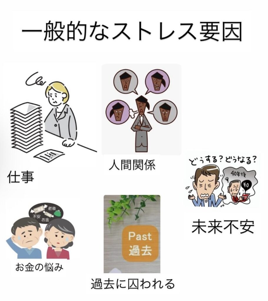 ストレスの主な原因は仕事、人間関係、将来不安、過去の囚われ、お金です。
