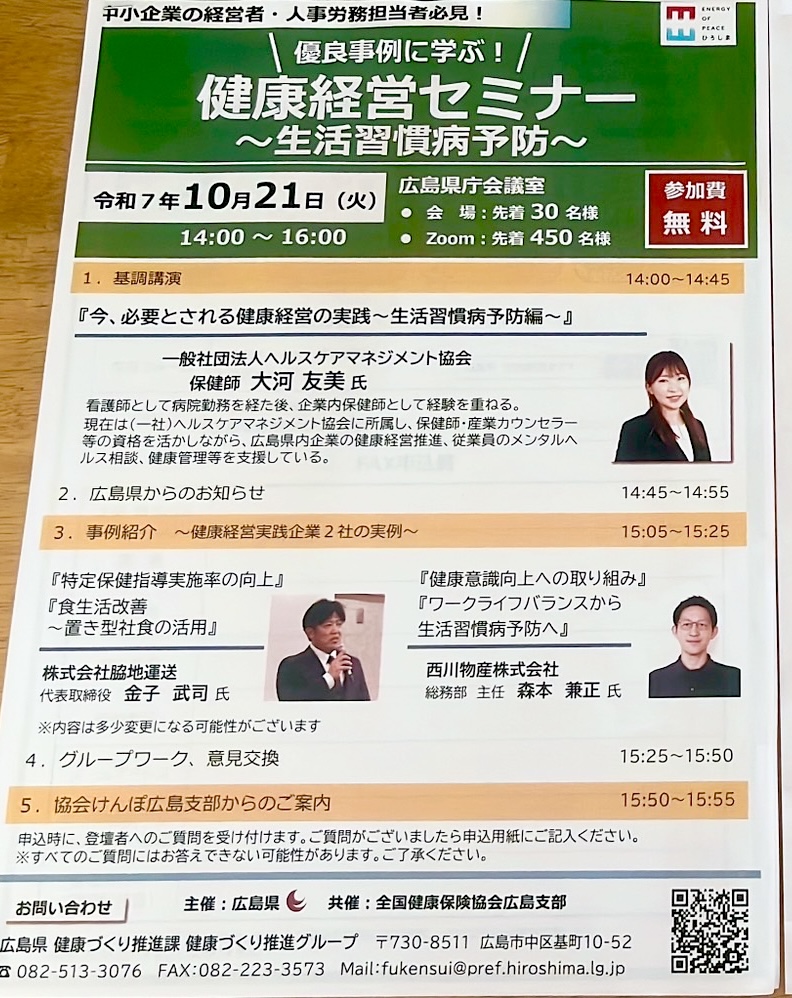 広島県主催、全国健康保険協会広島支部共催、一社ヘルスケアマネジメント協会コーディネートのもと、