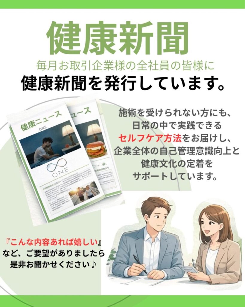 毎月健康新聞を発行しています。 投稿日 2026-02-18 カテゴリー お知らせ 毎月、お取引企業様の全社員の皆様にお届けする為健康新聞を発行しています。施術を受けられない方にも、日常の中で実践できるセルフケア方法をお届けし、企業全体の自己管理意識向上と健康文化の定着をサポートしています。「こんな内容があれば嬉しい」などご要望がありましたらぜひお聞かせください。 セルフケア 健康経営 出張整体 福利厚生